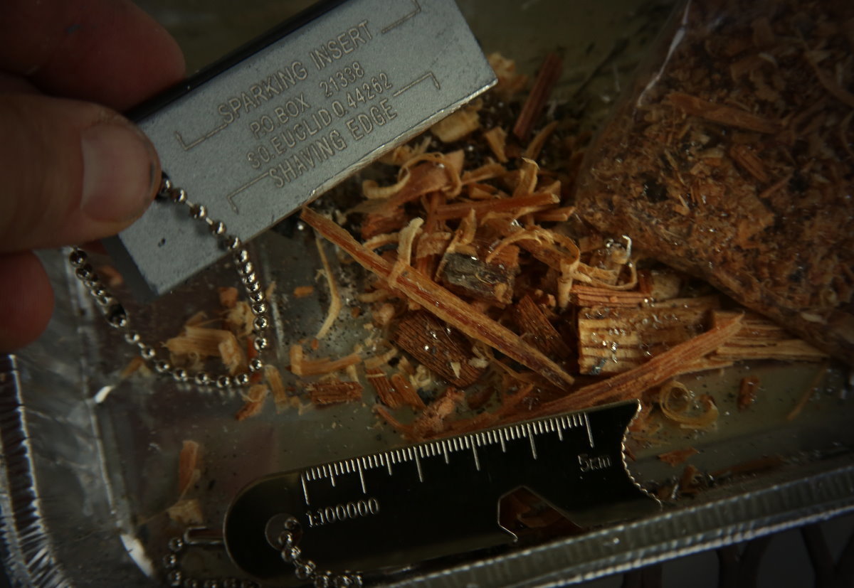 The black stick is ferrocium. As you can see from the pictures, I chose to use one of the thick ferrocium stick starters for most of my tests. My experience so far is that I must not have firestarting mojo, because it isn’t easy to repeat a process whatsoever. The ferrocium rods, and this goes for the small ones and the big ones, don’t seem to have a formula for when they spark and when they don’t. I tried to scrape a little first, tried to scrape back and forth, angled the striker, fast, slow, long, short, etc., but sometimes the steel scrapes pieces off, and sometimes it sparks. This makes the rod wear away in large peels without much control over how much rod you are losing whatsoever. I don’t get it.