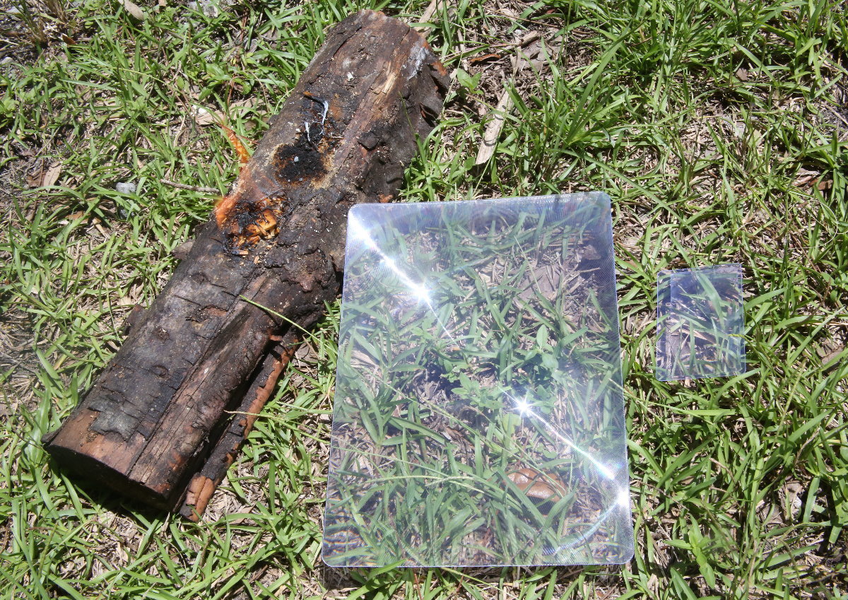The large magnifier could light anything even slightly dark colored. The military firestarters didn't even get warm though. This stick burst into flames in like 5 seconds in the direct Florida sun.