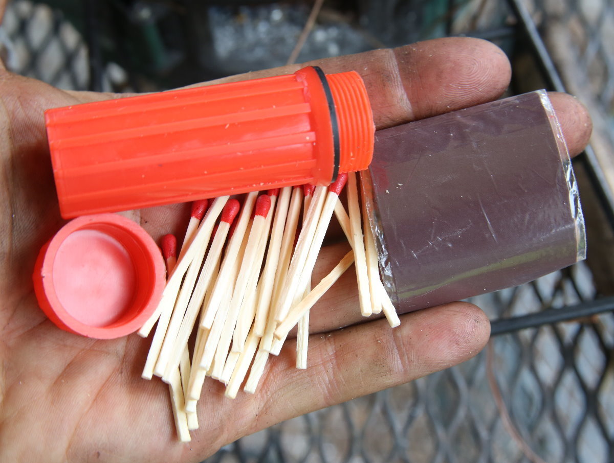 You crack off the tip of the pine pitch shell and the match heads are inside foil and twine. You strike the matches on a little piece of sandpaper in the tape.