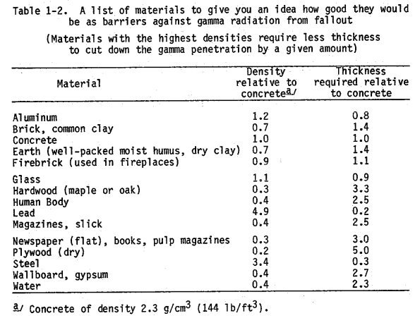This is a comparison chart from FEMA Radiation Safety in Shelters on different materials and their relative thickness to concrete that you need to attenuate as much radiation. It is all about pure weight.