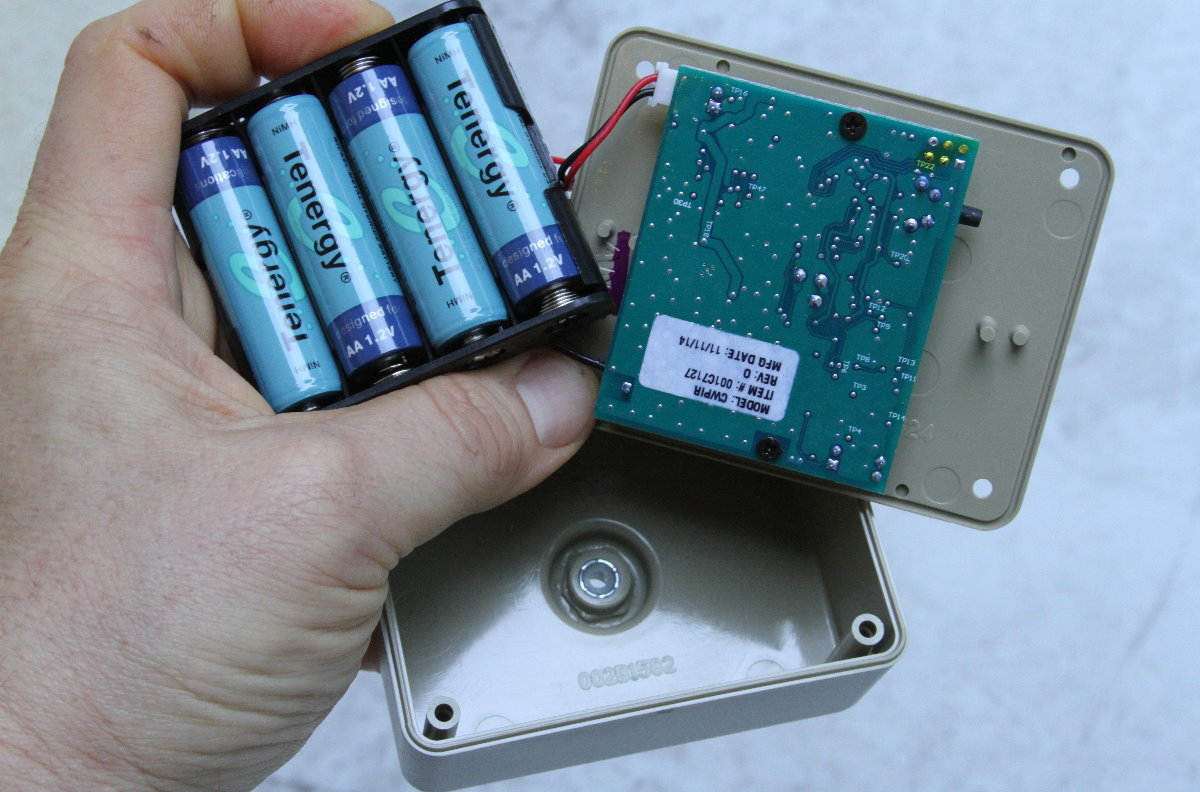 - No warning to the intruder. – The default on the Chamberlain sensors is a green LED that points forward, toward the threat, but the units themselves are just circuit boards screwed into a plastic inclosure. It is easy to cover the front facing LED with tape or liquid electrical tape.