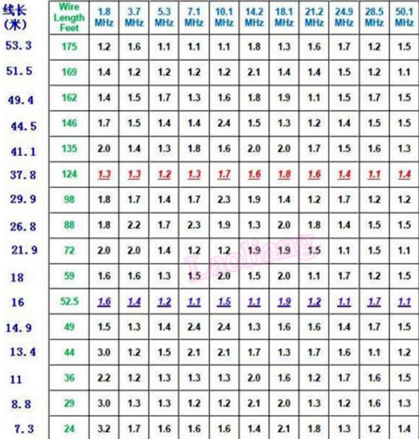 This is the longwire chart from the video that is tough to read. The far left column is meters, then how many feet of wire. Then it shows you the Standing Wave Ratio, or SWR, for each of the amateur bands. As you can see, 52.5 works pretty well.