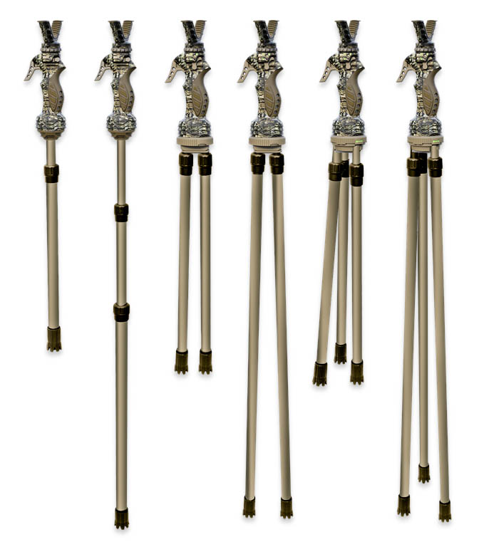 The monopods and bipods are more portable while the tripods can be used with trail cams and other stand-alone accessories which makes them more versatile. The tall monopod is a great option for taking photos and handy while scouting in the off-season.