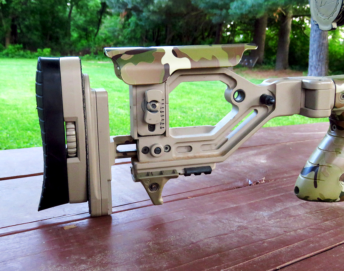 Many chassis systems on the market offer a fully adjustable buttstock that provides cheek height adjustment and length of pull adjustment, in addition to sling attachment points. Some models, like this Accuracy International chassis, offer additional adjustments of the butt plate to set it up perfectly for your shoulder.