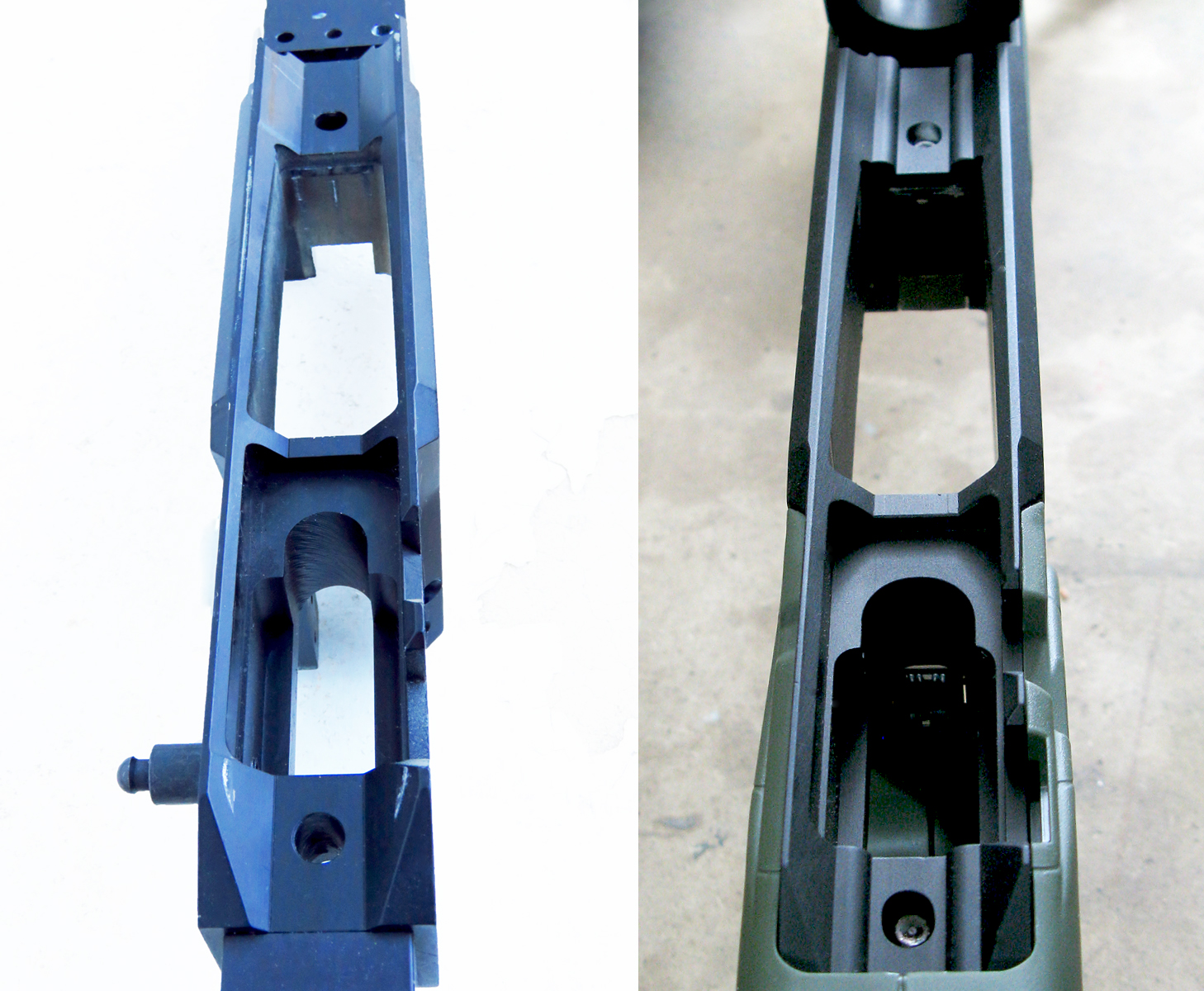 The bedding interface is where chassis systems are either loved or hated. Their loved because they often negate the need for an expensive epoxy bedding jobs and hated because sometimes they have to be skim bedded anyway. Traditional V-block bedding blocks like the one on the left is a common configuration in many chassis systems but some manufacturers are improving them, like the Accuracy International chassis on the right. The ridges on either side of the action screws provide increased support at the tang and front of the action to reduce the possibility of the action being stressed once torque is applied.