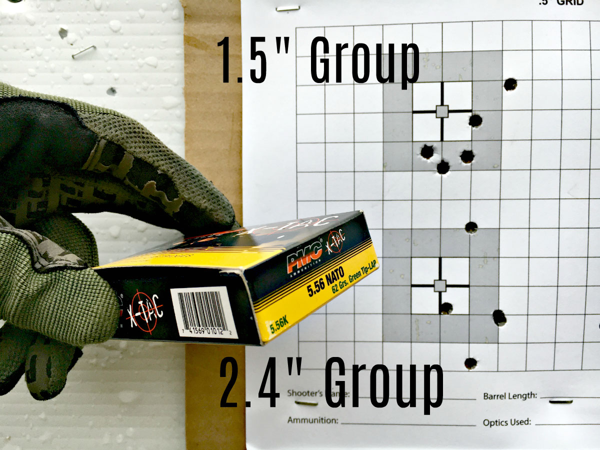 Surprisingly, the PMC X-Tac 5.56mm 62gr. Green Tip ammo did pretty well. Grouping at 1.5” an 2.4”. Which for a green tip is pretty decent in my experience.