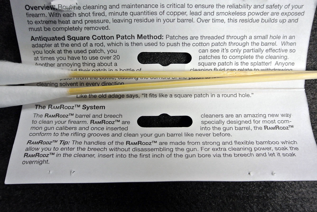In the end, I think that is the selling point. Most conventional cleaning set-ups require multiple small parts and pieces. They get filthy, and require constant manipulation. You don’t want to touch the crap you flush out of a gun barrel, and wearing gloves can be a hassle. Now you have something that is easy to use, requires no assembly, and is easy to dispose of. And best of all, a bag of RamRodz is selling for less than $9.