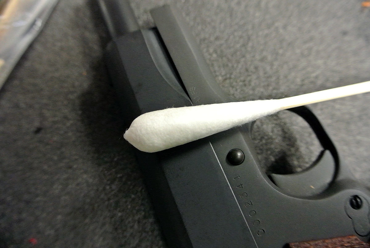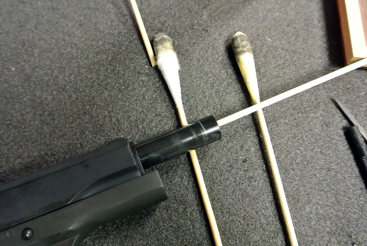 Cleaning away. The handle is flexible enough to go in through the ejection port on a 1911 but this is easier.