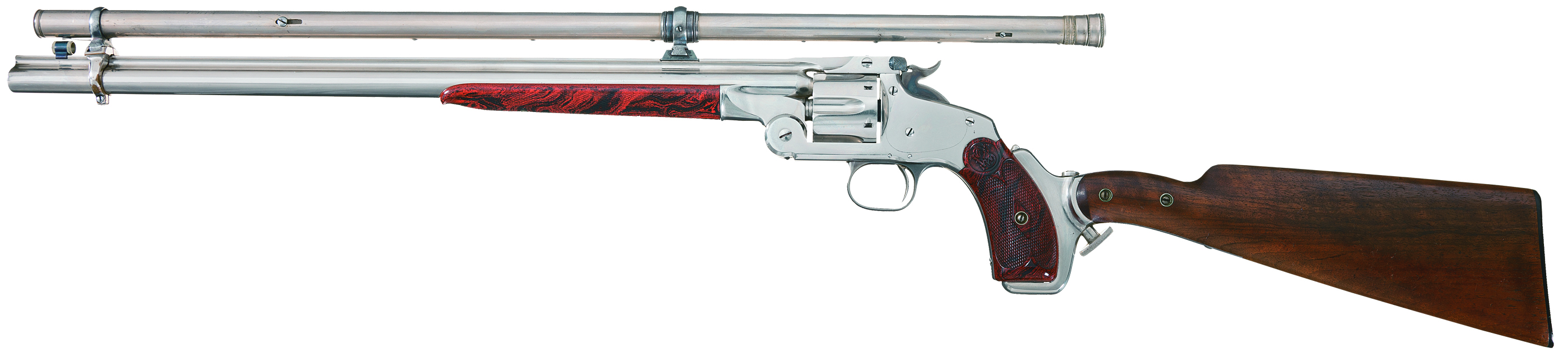 It should have been a wild success. The New Model No. 3 revolver was already being custom ordered by famed exhibition shooters such as Ira Paine and William F. Cody. Outfitters in the West were also writing to the company requesting to “take your new style pistol, give it an eighteen inch barrel and a cylinder heavy and long enough to use a long cartridge if necessary, with a rifle stock.” Another letter from Black Hills wrote, “I want a rifle with a revolving cylinder made upon the same principle as the small S. & W. Revolver… something suitable for deer hunting, bear hunting and also Indian hunting if necessary.” For the record, those willing to hunt bear with this cartridge either had a death wish or more bravery than they had brains. The demand was present, the reputation already established, and the new cartridge created. The only thing to do now was to put it out to market.
