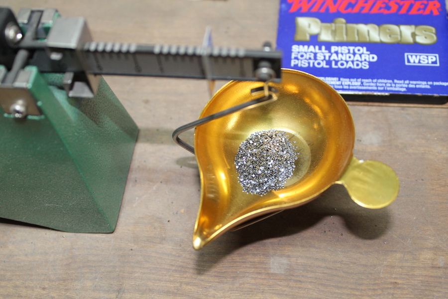 – scoop the proper ration of powder. I initially used a very cheap diamond scale to measure powder measurements that I filed cases to meet. Smaller cases are safer, i.e. .380 case to measure 9mm charges. Scratch mark every case for powder and measurement.