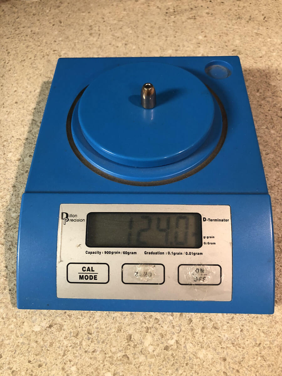On my scale, I weighed the 20 bullets. Four bullets weighed 123.9 grains, three bullets weighed 124.0, nine bullets weighed 124.1, and 3 bullets weighed 124.2. That is a spread of .3 of a grain overall. Better than acceptable as far as I am concerned.