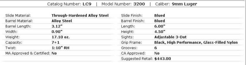 I’ve owned this weapon for 3 weeks now & absolutely love it. For many, many years, my primary CCW has been my trusty S&W Model 39, but I am older now, with a few aches and pains in places that just made the S&W Mode 39 too uncomfortable any more. I stumbled across this LC9 totally by accident, out looking at .40 S&Ws’. I was unaware of it’s existence or any of the hoopla surrounding it. I am not a ‘tacti-cool’ guy & I don’t buy a weapon because of fanfare or a following. I buy weapons that are proven. Along with my S&W Mod 39, you’ll find a Colt M1911A1, a SA M1A1, an Armalite AR-15, a Winchester 1200 and the required Ruger Mark III and 10/22. Each of these weapons is 30+ years old, each all original, complete with original packaging. With the exception of the .22LRs’ and the S&W Mod 39; they were fired, battle-sight zeroed and put away. My weapons were selected & prepared to do one thing and to do it well. Wow, how the hell did I get on to that rant & ramble??? Anyway, the LC9. It functions flawlessly and in less than one box of ammo, you’ll know your sight picture & will bouncing tin cans around at 30 yards. My only dislike is the price of spare magazines. However, I did purchase two because the weapon only came with one. I cc this weapon in a high riding, slightly canted pancake holster with thumbreak, right in the small of my back. Just left of it I have the two spares in a FOBUS 4500P magazine holder. The FOBUS KTP11 and the FOBUS KTP11A (ankle) holsters fit the LC9 perfectly. Buy it. Period.