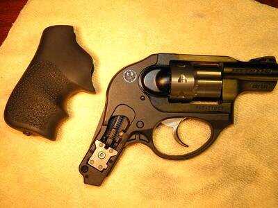 | This is the new Ruger LCR-22. It is an exciting gun to shoot, and a useful little revolver applicable for many situations. Fire control components are housedin the polymer lower frame. This is as much disassembly as Ruger recommends for routine maintenance. Drawing from a concealed holster and firing 5 rounds as fast as I could pull the trigger at 10 feet from the target. |