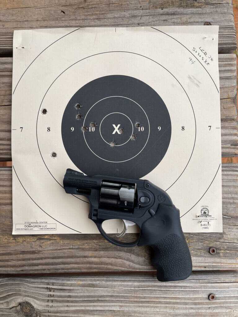 After chronograph testing, I shot my modified “Test” drill. This consists of five shots, fired from five yards, in five seconds, repeated twice. The drill is fired on a B8 bullseye and scoring is done based on the scoring rings. For score, I fire the drill cold and I only count my first run. With the LCR .38, I managed to fire a 94 out of a possible 100. I found that I pulled most of the shots left with two rounds in the 9-ring and two rounds in the 8-ring. I determined that these were my last four shots where I lost the front sight blade and my grip shifted. I was pleased that my time was 3.75 seconds.
