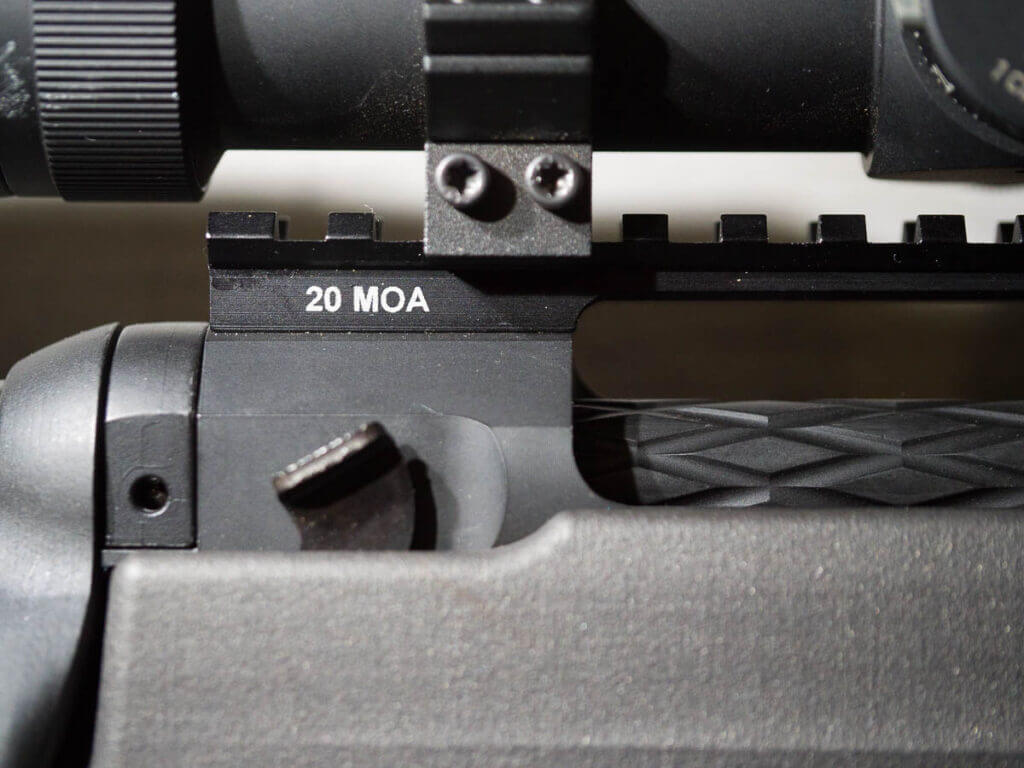 Up top, a 20-MOA Picatinny rail comes standard so you don’t have to run your optic’s turrets as far to be ready for distance Shots.