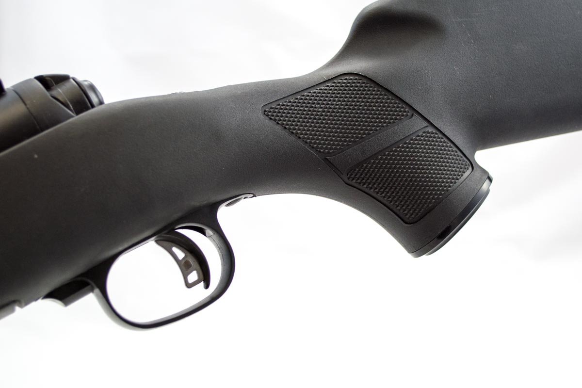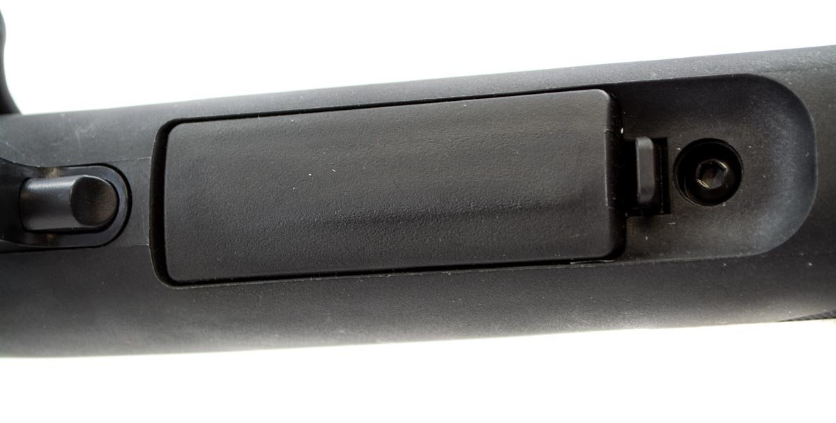 The stock is synthetic with aggressive texturing on both sides of the pistol grip and forend. A soft recoil pad that’s about one-inch thick does a surprisingly good job of dampening recoil on this 7 ¼ pound rifle. The barrel itself is carbon steel with a matte finish, consistent with its intended field use. The action mounts to the stock with a large Allen screws just forward of the magazine and on front and back of the trigger assembly. The barrel is free-floated and I could easily run a business card between stock and barrel all the way back to the receiver, but there’s no easy way to tell isf there is enough clearance to prevent the two from touching during the firing sequence.