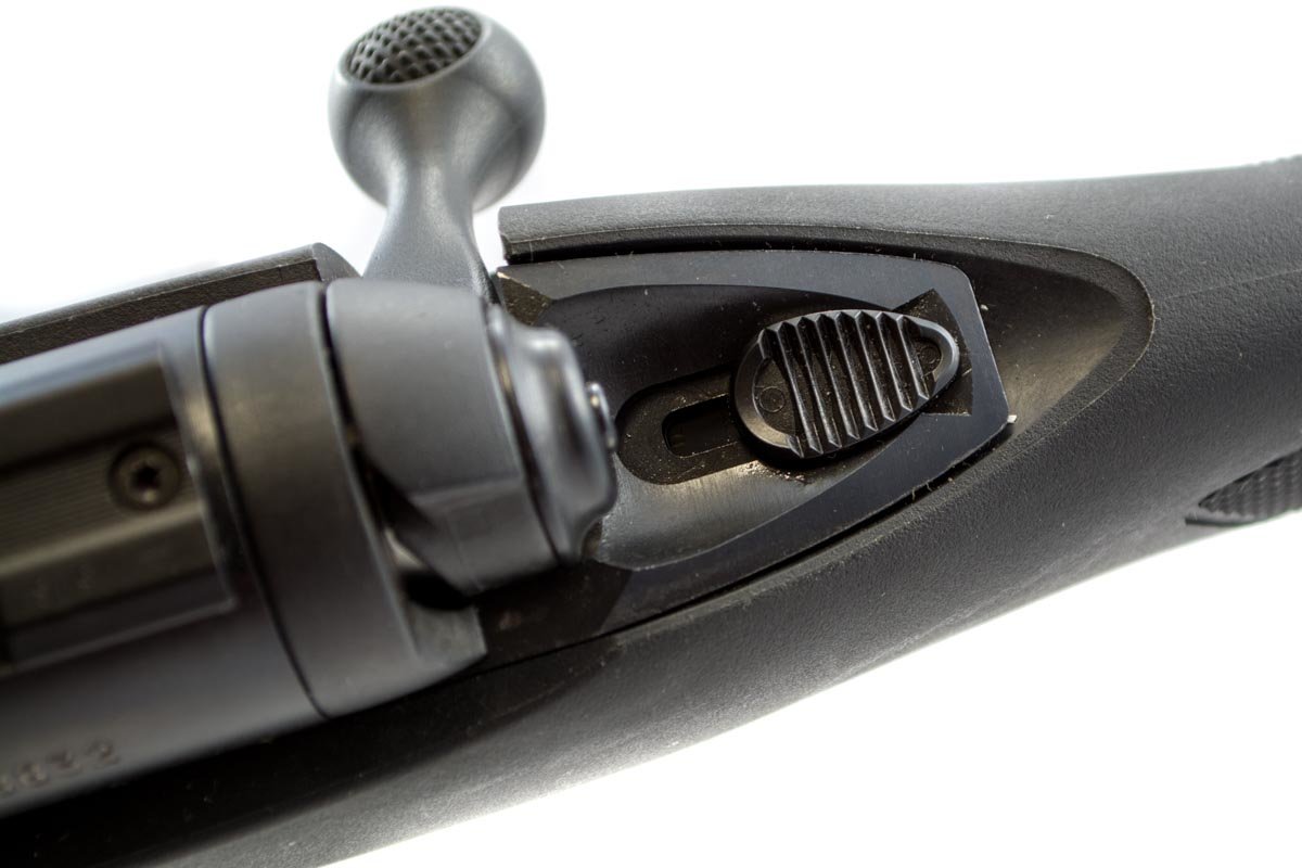 Safety first, so let’s start there! The teardrop shaped safety slide behind the bolt has three positions. Pulled back towards the shooter, everything is locked – the trigger won’t move and you can’t open the bolt. Move one click forward to the middle position and the trigger is still locked, but you can operate the bolt. Push all the way forward and everything works. There is a red dot that is partially covered in the middle position and completely exposed when the rifle is ready to fire.