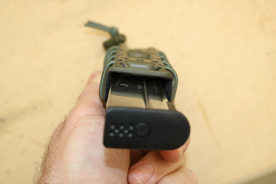 First up, the Scorpion Hard Shell Kit, a complementary product to the soft shell. Not everyone is okay with floppy mag holders, so G-Code made another option. Their hard shell kit is not quite as universal, but it does do a good job of covering multiple platforms with a single mag holder. The reason for that is the design difference. The hard shell’s basic structure is two pieces of Kydex, held together with a bungee cord pressing them into each other. Imagine if you took one of your normal magazine holders, and cut it in opposite corners. To keep them from slipping, there is an elaborate cut in the bottom that acts as a lock while allowing some sideways movement. The bungee cord is laced around them and pulls the pieces together, which also provides retention for your magazine. Like the soft shell models, there is a cord lock on the bottom, which allows you to set the retention level you like.