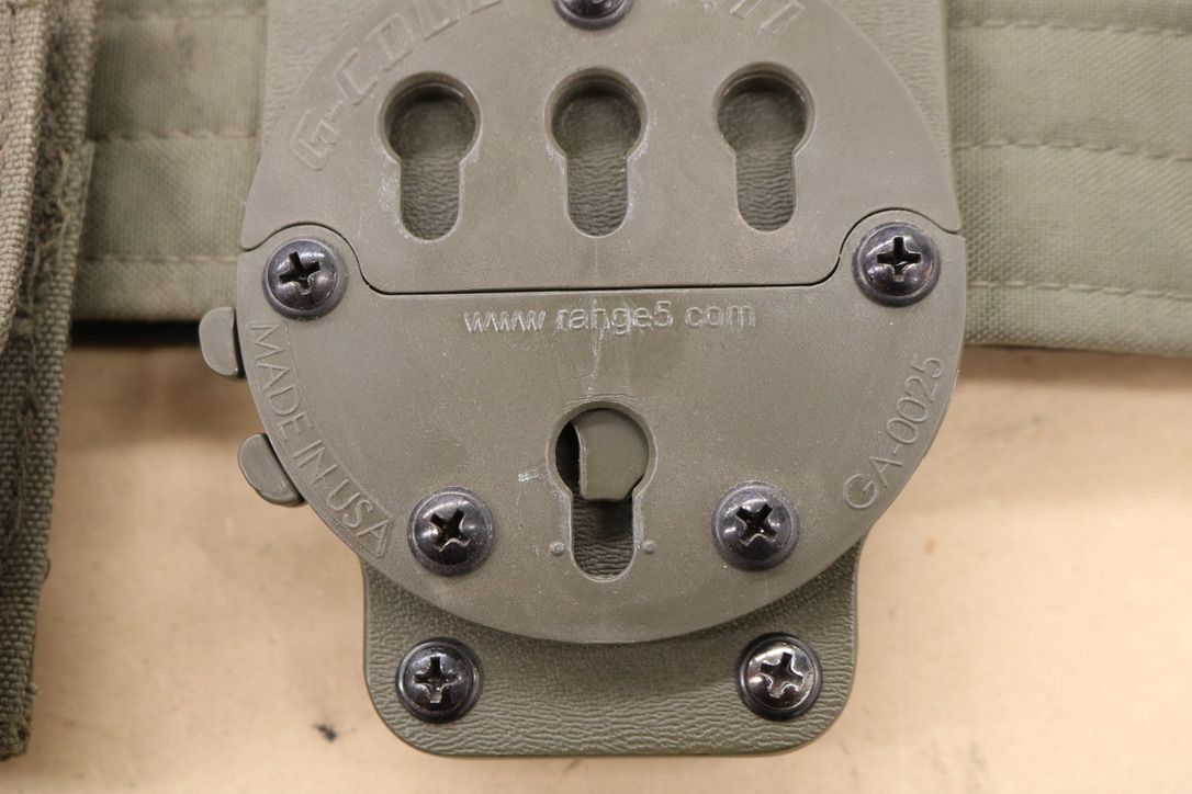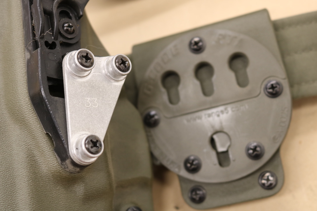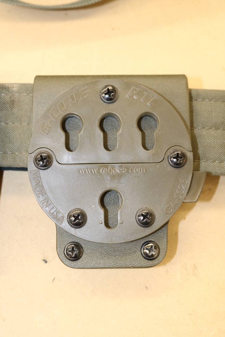 For whatever brand of holster you use, Safariland to Bladetech to G-Code themselves, the quick change works the same. A base plate goes on your belt, in the offset or belt position you like. G-Code then has an adaptor plate that mounts to the back of your holster. It has pegs that stick out and acts like an overgrown key mod system. Put the pegs in the holes, press down, and slide the lock through. Done and done. To swap holsters, reverse the process. It takes about 10 seconds, and over the years has proven incredibly durable.