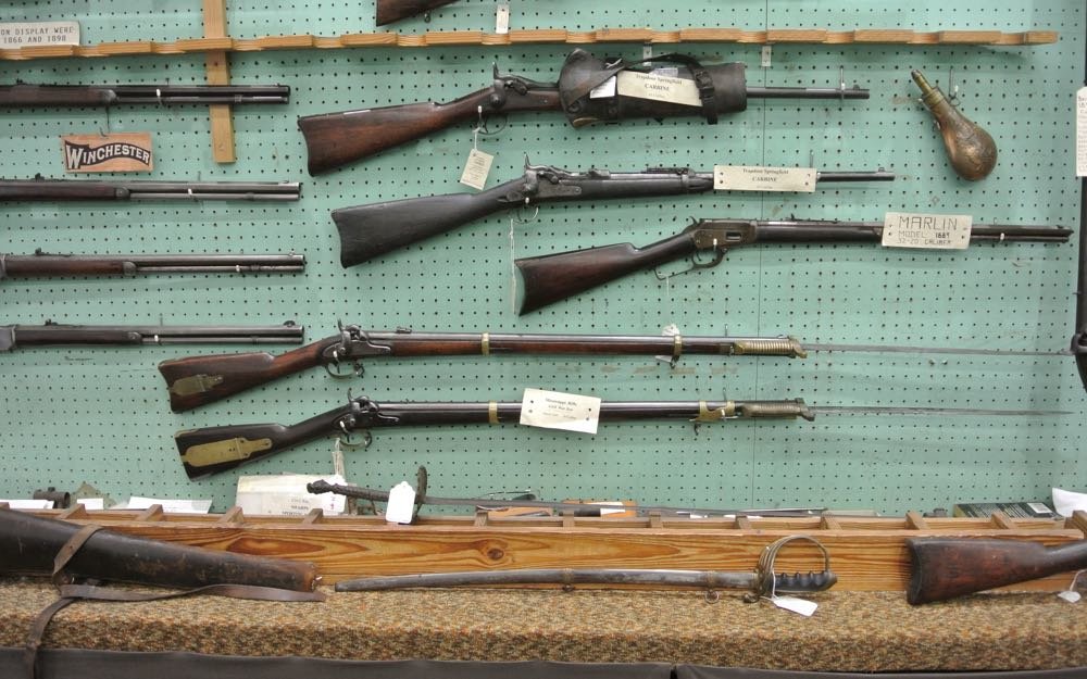 Some of the rifles in the Cohen’s shop. Two “Mississippi” Rifles on the bottom. Also the trapdoor with the saddle holster is rare.