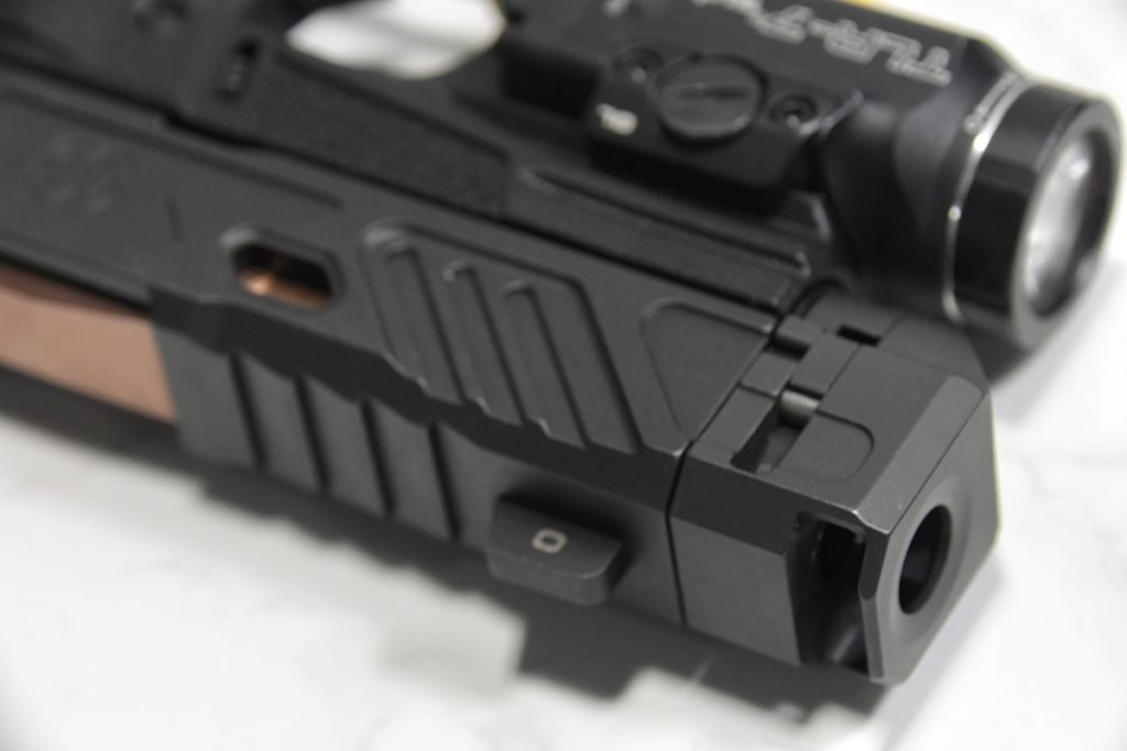 This cam-locking compensator is currently only available for purchase with this gun but It does not utilize any muzzle threads and is legal for use in states that don’t allow threaded muzzles.