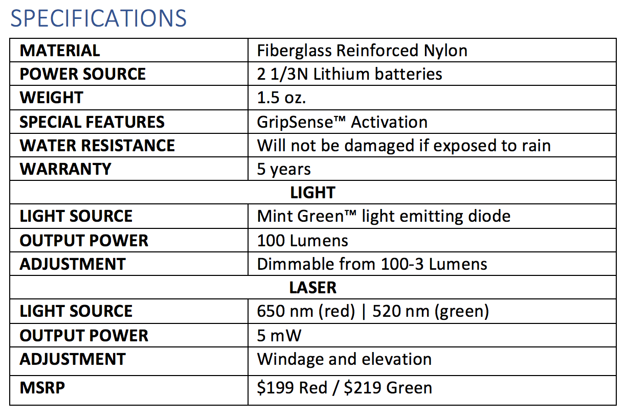 LaserMax describes the light as a 100-lumen mint green light. This is an LED light that delivers a slightly greenish hue but is still quite usable. I think the green light is designed to be picked up more easily by the eye.