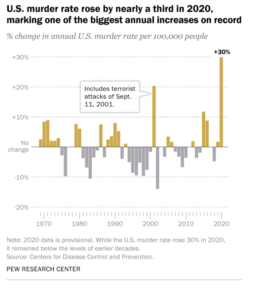 In 2020, the country witnessed a historic spike in murders. Compared to 2019, which averaged about 6 homicides per 100,000 people, there were 7.8 homicides per 100,000 people in 2020, according to Pew Research. That’s a 30 percent jump year-over-year!