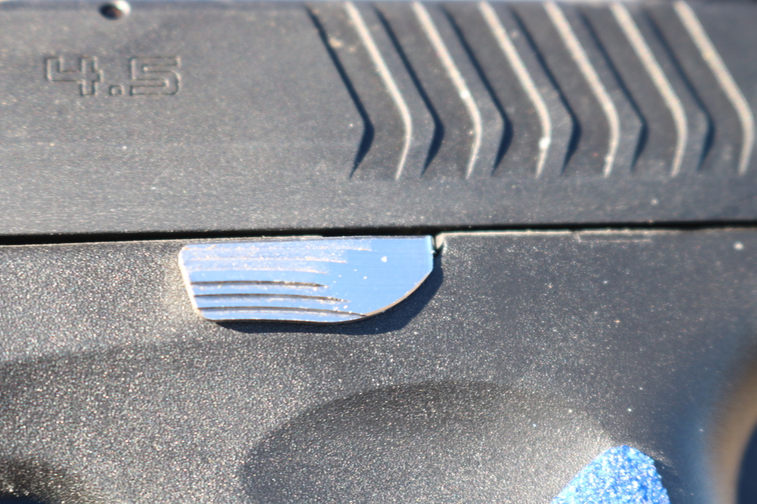 Next, they shaved down the slide release, for closer palm to frame contact. The XDM family already has excellent grip texture, for a factory gun. Springer Precision turned it up to 11 by installing grip tape, my all time favorite. I prefer grip tape to a stipple job, mostly because it is replaceable. Both wear out over time, but grip tape cost $10 to refresh. The new grip locks into your hand, in a way nothing else does.