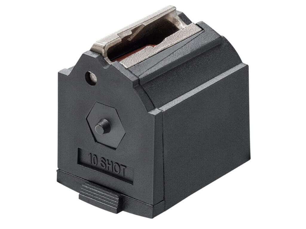 Unlike all the bolt-action .22s I’ve owned and fired, the 2020 Rimfire works from a rotary magazine that is flush with the stock’s base. It holds ten rounds and is cross-compatible with Ruger 10/22 mags. This is a really cool design choice. My other classic .22s use stick magazines that hang down from the receiver and are easily snagged, or they have a tube magazine that is slow to reload.
