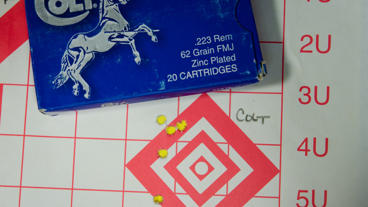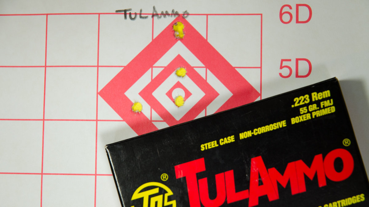 The chambering of the 3T-M is 5.56 NATO, meaning you can shoot either the increased pressures of 5.56 or less rowdy .223 ammo. You will typically sacrifice some long-range accuracy for this (versus .223 only), but you gain tremendous advantage in versatility, especially when ammo gets hard to find. But in terms of the observed accuracy of this rifle, I have no doubt that it far exceeds the abilities of this shooter. Results with several brands of ammunition varied at 100 yards but produced some respectable groups.