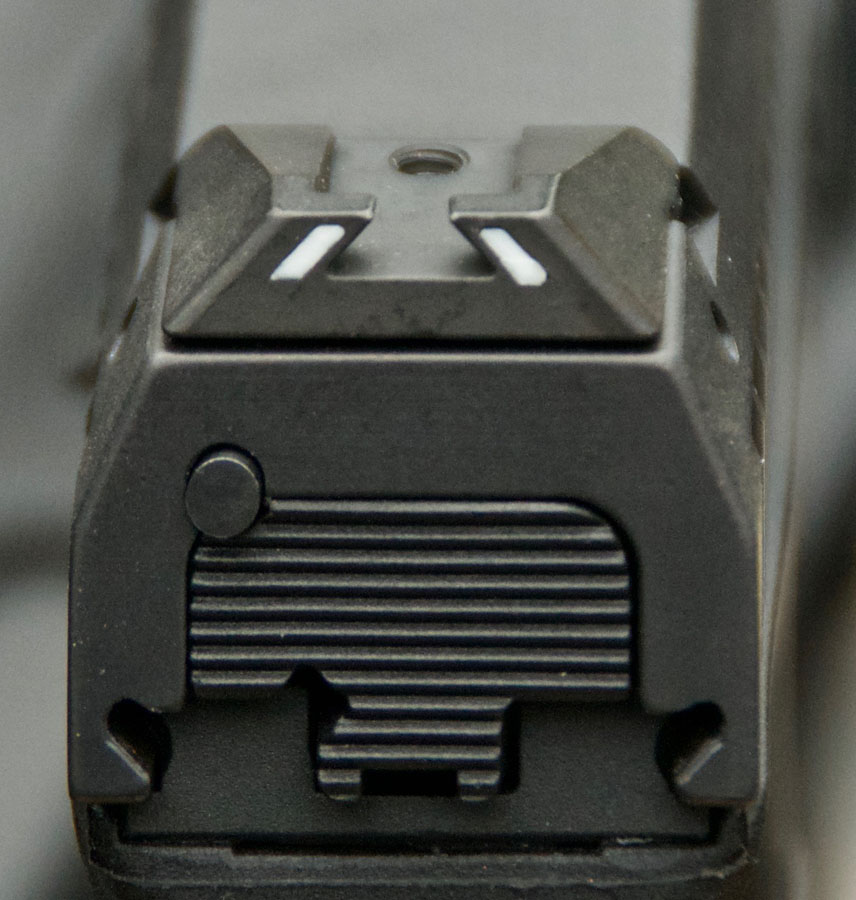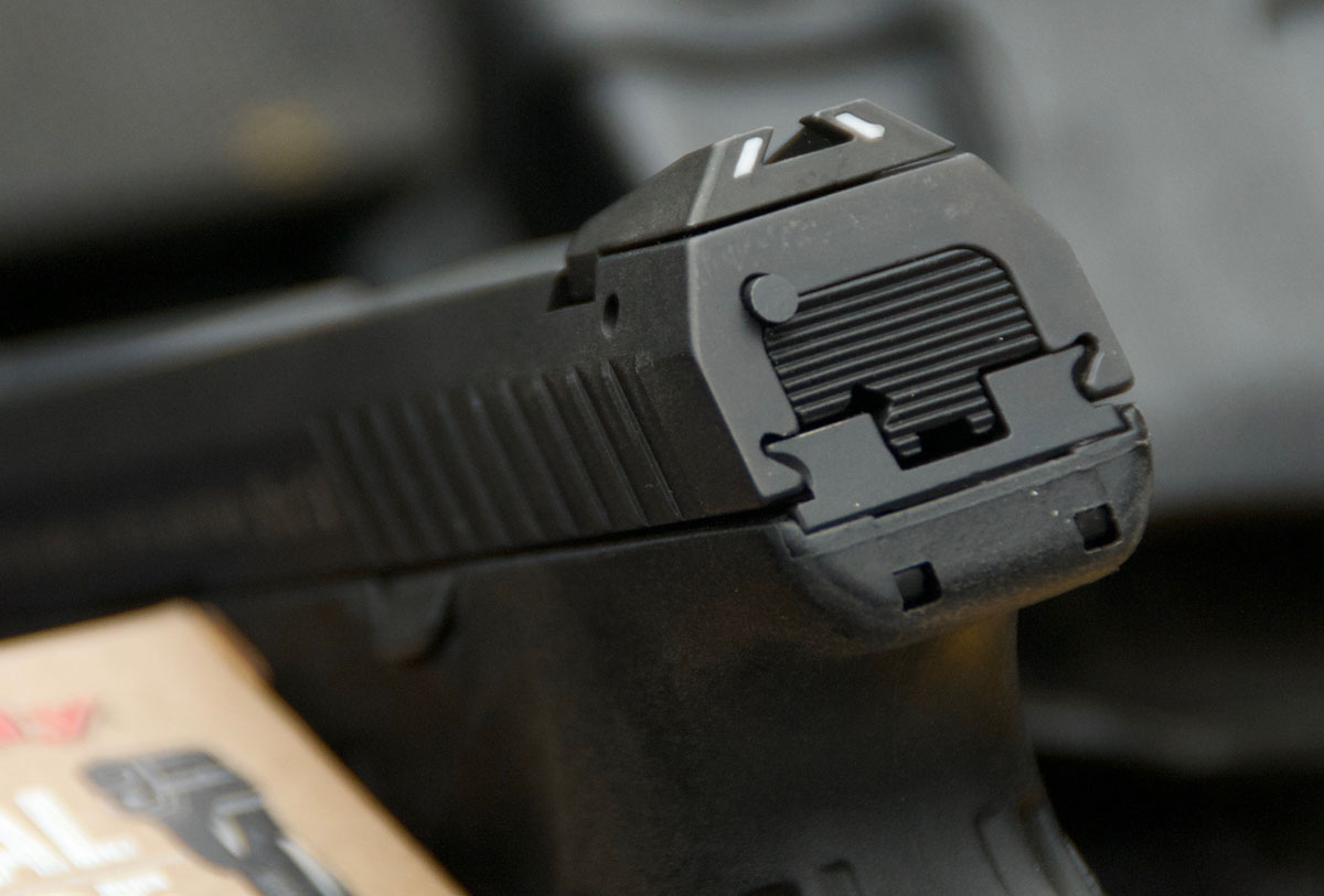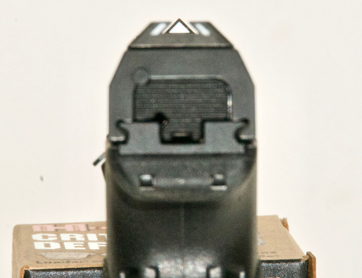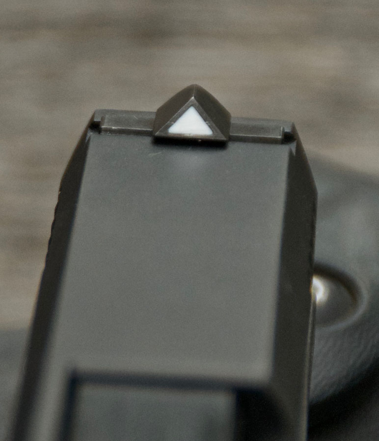 The next out of the box thing that you will instantly see is the use of a pyramid/triangle-shaped front sight and a “trapezoid” shaped cut out in the rear sight. Okay, it definitely seemed a little weird when I first saw it, but it is completely natural for our eyes and mind to line up the angular sides and center the front sight.