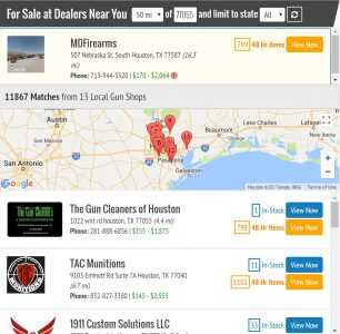 Do a search on GunsAmerica. Pick something easy like “glock” or “remington.” Do you see this map at the top, that’s on the right here in this email? If you don’t, try changing your zip code to 77055.