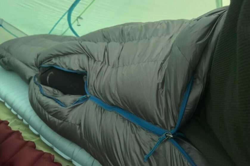 Even at 6’2″ I had some wiggle room. I am also a side sleeper and had no issues rotating around and finding plenty of warm comfortable positions to fall asleep in. One thing I did have trouble with was finding the zipper when it was fully zipped up in the middle of the night. The bag sort of rotated around on me. Due to the double-sided zipper though, I was able to find the pull string on the inside and open it back up.
