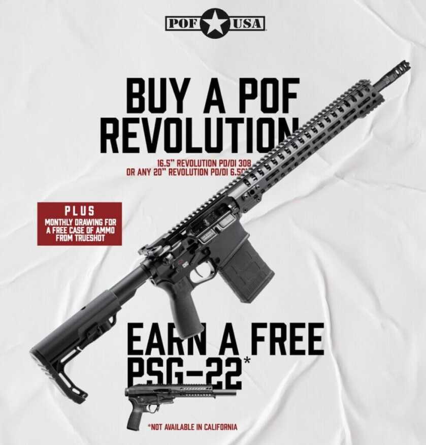 - The POF-USA “Revolutionary” promotion includes an opportunity to earn a FREE PSG-22 and get $20 off a case of 5.56 or 7.62×51 ammunition from True Shot Ammo. Additionally, you will be entered into a monthly drawing for a case of free ammo from True Shot Ammo. All of this is offered with the purchase of either a:
