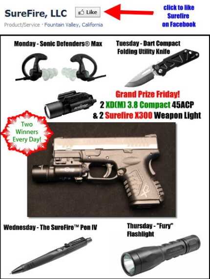 1. Details – Starting Monday, December 12, 2011 and ending Friday, December 16, 2011, SureFire LLC will be posting a code to their public Facebook page. Email this code to [email protected] to enter the giveaway. Two random winners per day will be chosen and notified. The prize list is announced as follows.