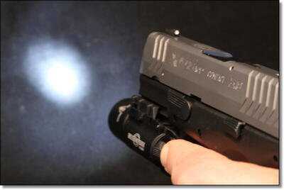 Since this is a SureFire project, we’ll start with the grand prize X300. If you haven’t tried these SureFire lights they are really something else. The X300 is a 170 lumen two battery (123A) LED light, brighter than a 4 D-cell flashlight. It sells for $275 through SureFire, or through internet retailers for just over $250. It weighs 3.8oz, including the batteries, and on the XD(M) 3.8 slide it fits the rail perfectly. The light can either be activated with a momentary switch or clicked to a permanent on position.