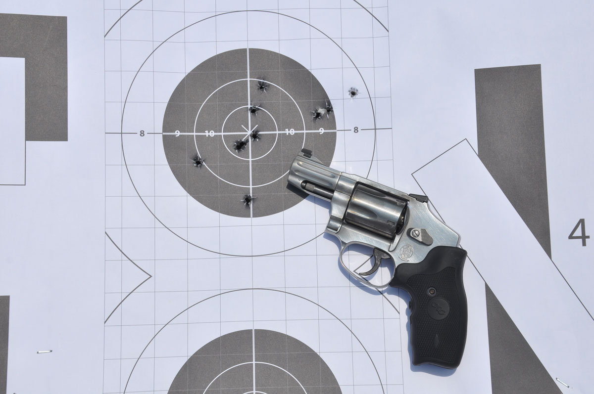 The remainder of my shooting was done with American Eagle 158 gr. RNL loads. I fired several of my standard drills, to include a modified Hackathorn 10-10-10 drill. From seven yards, I fired two strings of five rounds with a par time of five seconds for each string. The target was an NRA 25-yard bull’s eye. On my first run, I made the par times and managed to shoot a 95 out of 100 with 3Xs. I let one round get away from me and it found the 8 ring. Obviously, the combination of a good action, great sights, CT grips, and .38 Special ammo, made the 640 Pro a real performer.