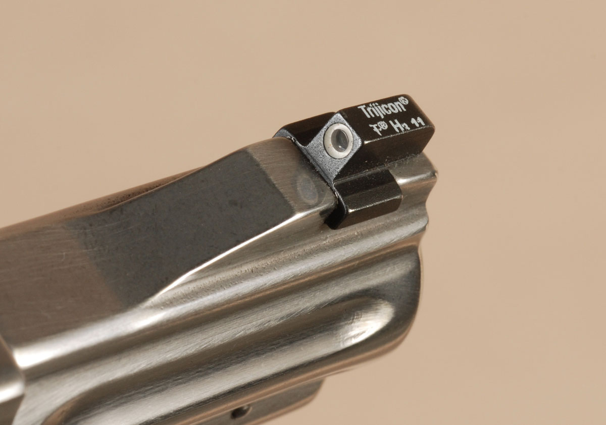 The front sight is dovetailed into the base and features a white ring with a Tritium insert.