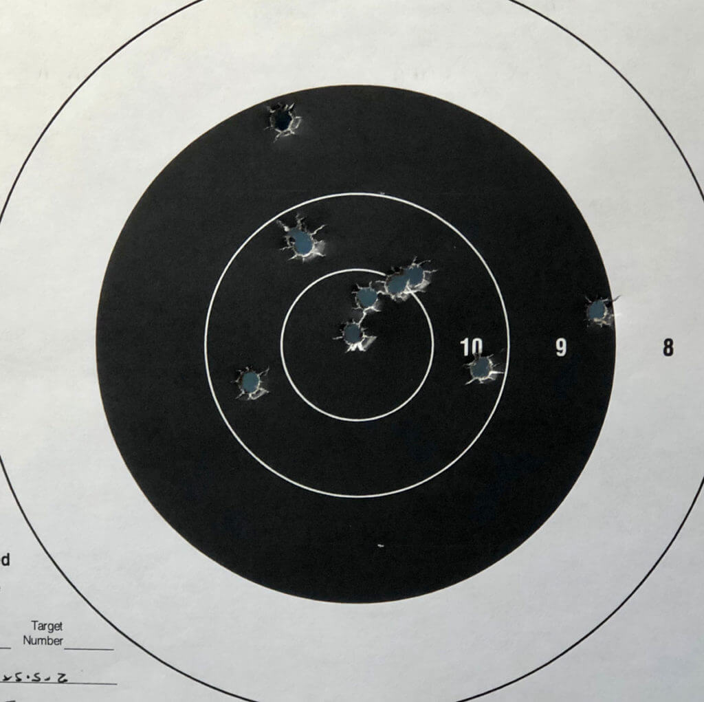 Most of my shooting was done from seven to ten yards. It is important, especially with fixed sight revolvers, to ensure that your chosen load hits to point of aim. Since the Model 649 is chambered in magnum, I was curious to see where the point of impact was with the selected .39 +P loads. At seven yards, I found that the Federal HST hit the point of aim. However, the Speer 135. Grain Gold Dot hit approximately 1” low and the 110 grain Hornady load hit approximately 2” below the point of aim. I was shooting at an indoor range and battled both lighting and the extremely small rear sight.