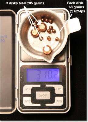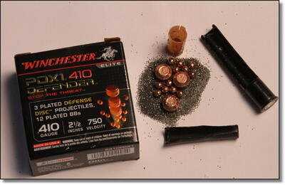 The 2″ Taurus Judge suffers this same fate. Because a lot of the powder burns outside the barrel the velocity is reduced considerably from the ballistics you would expect out of the same shell in a longer gun. I was able to measure the Winchester PDX1 .410 shotshells at 610-650 feet per second, averaging about 625. The package says 750 feet per second, which must be what they clock in the longer version of the Judge. The total payload for the PDX1 shell is about 310 grains. That works out to about 268 foot pounds in total energy delivered if all of it reaches your target. Each of the 3 disks in the shell measure about 68 grains, which works out in the same formula as 58 foot pounds, not a lot of punch individually, but as a whole, including the 12 BBs, a serious defensive round.