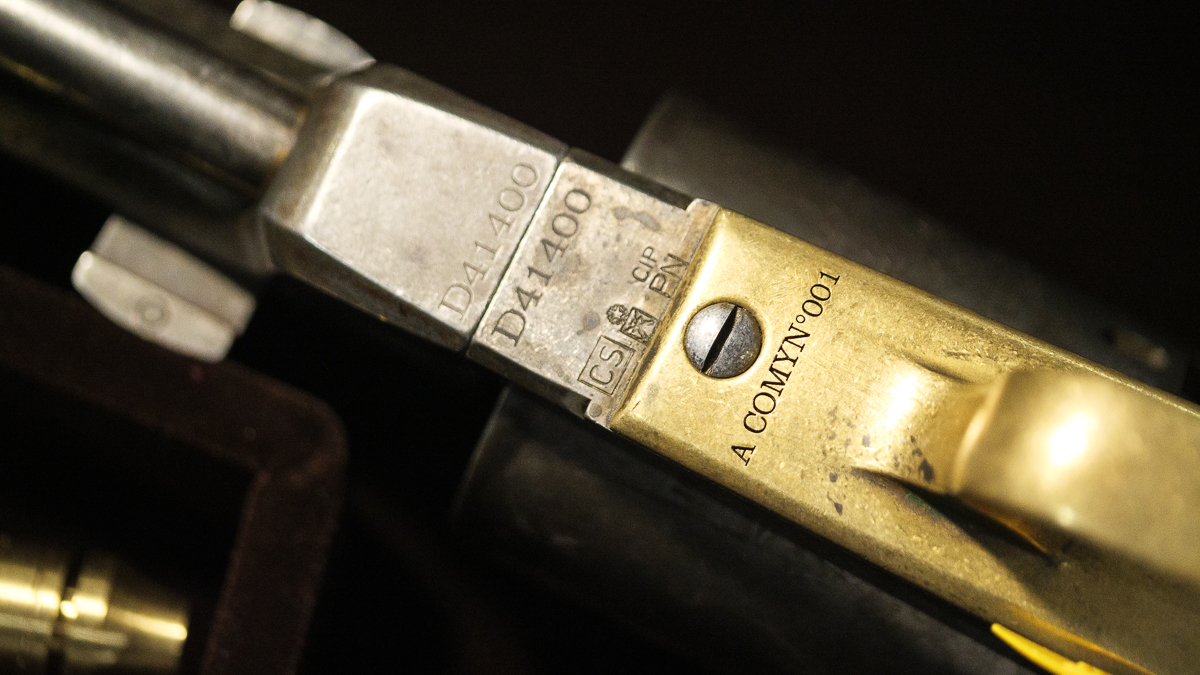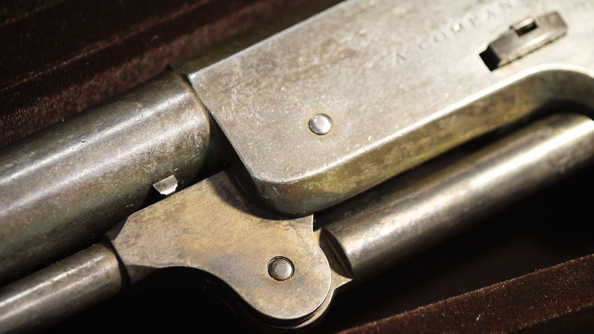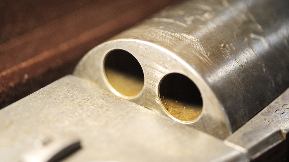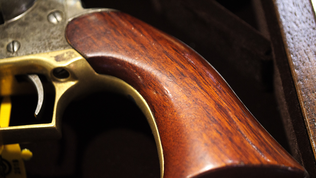 This gun is made following the original dimensions from Colt. It’s a beast with a 9-inch barrel with a .456-inch bore. The rifling has seven grooves with a right-hand twist and it twists once in 103 inches. It shoots a .44 caliber bullet, and the six cylinders take about 30 grains of black powder. The steel is all blued and then chemically washed to give it the classic patina. The grips are walnut.
