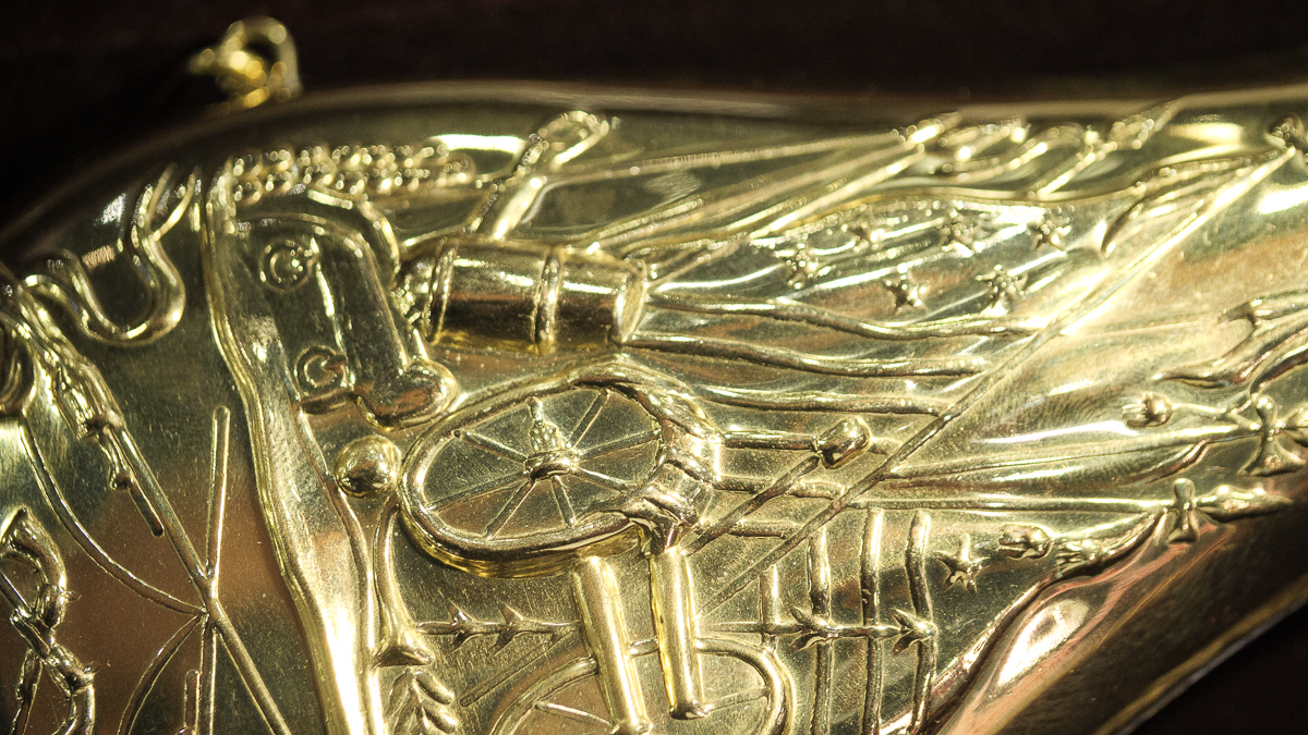 - The powder horn has a brass finish.