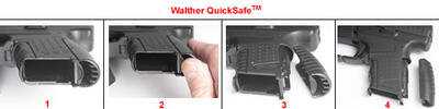 | Click on the image here to download the coupon for the $50 rebate from Walther on the PPS. Like this gun wasn’t already a huge score now you can get $50 off! Click at direct link here. The Walther PPS could potentially be the best Micro-9mm (and .40S&W) on the market. These are some of my 10 yard targets with the PPS. The ammo boxes you see in the picture were only a few of the types I used to try to make the PPS fail, including some old grubby reloads. The gun did not fail, no matter what I tried. The trigger on the PPS broke cleanly at between 6 and 7 lbs. It is a little scratchy, both forward and back, but this is my only complaint with the gun and it doesn’t impede operation or accurate fire. The Walther website on Smith & Wesson says that the PPS only comes with one 7 round magazine, but mine came with both the 7 and 8 rounders. There is also a 6 round that is probably a 2 finger grip. The Walther Quicksafe(tm) is part of the interchangeable backstraps. The disabling safety system works as promissed, and you have to congratulate Walther on such a unique and innovative idea that actually works. This is far more effective and practical than a gun lock and for those of us living in states with gunlock statutes, it is the best system I have seen. The extra backstrap that comes with the PPS also serves as a spare if you lose or break the one that fits your hand. There is a pin built into the backstraps that deactivates the disabling mechanism. Since Smith & Wesson handles all of the repair and parts issues for Walther, it should be easy to get a backstrap if you lose one, and at least you have a spare to keep the gun in service until it arrives. This is the image from the Walther website PPS page explaining how Quicksafe(tm) works. |