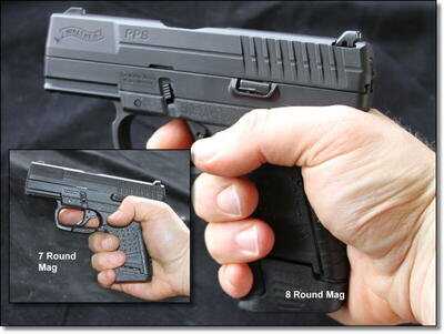 My test gun came in 9mm with both 7 round and 8 round magazines, but the website says it only comes with the 7 round. For me, with short fat fingers, both of these mags made the PPS a three finger gun. They do make a 6 round as well, and that may be 2 fingers. The .40S&W version comes standard with a 6 round mag, and they make a 5 and 7 round.