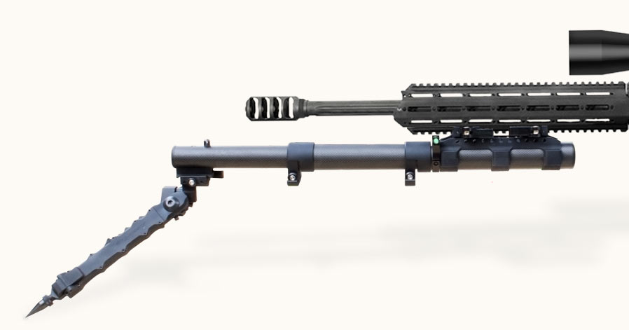 Kind of like long wheelbase vehicles, the BipodeXt is intended to offer increased stability. It’s a below barrel extension tube assembly that allows you to mount a rifle bipod well forward – in front of the muzzle. Kind of like a long sight radius on a pistol or rifle makes it easier to aim with precision, a longer “bipod radius” allows you to minimize rifle movement. With the fulcrum way out there, you have to move the stock more vertically or horizontally to drift off target. Carbon fiber and aluminum construction keep weight to about a pound.