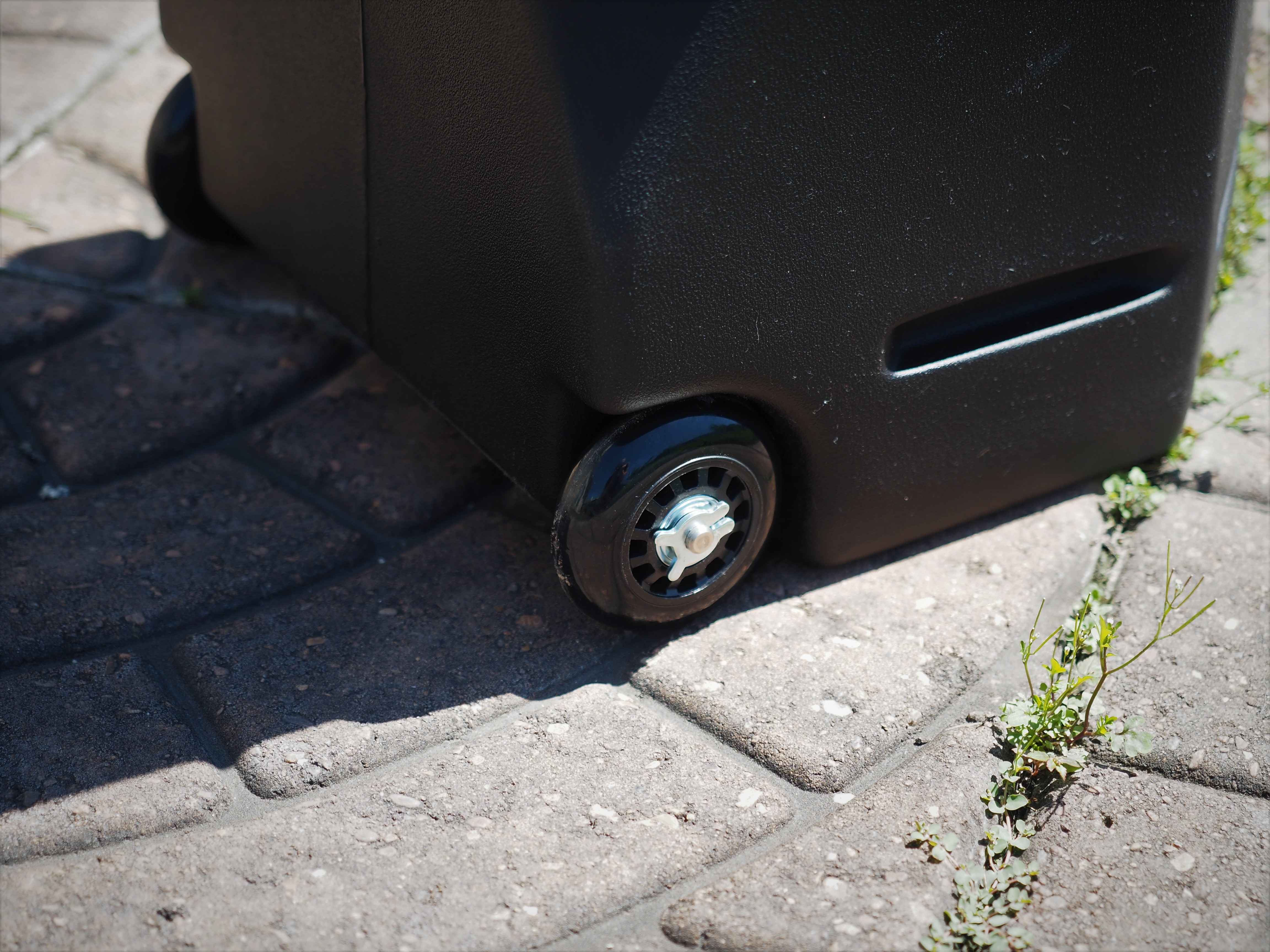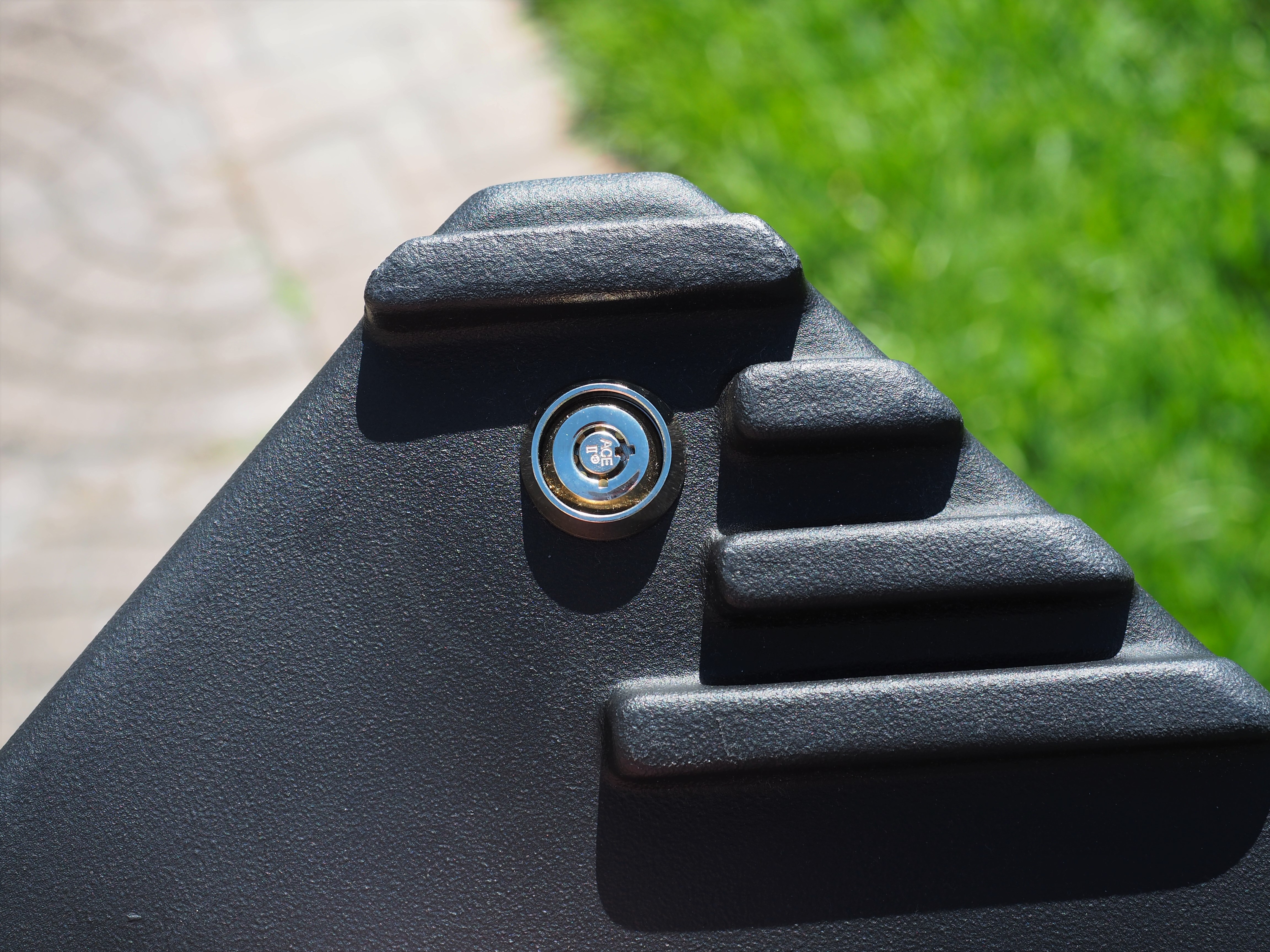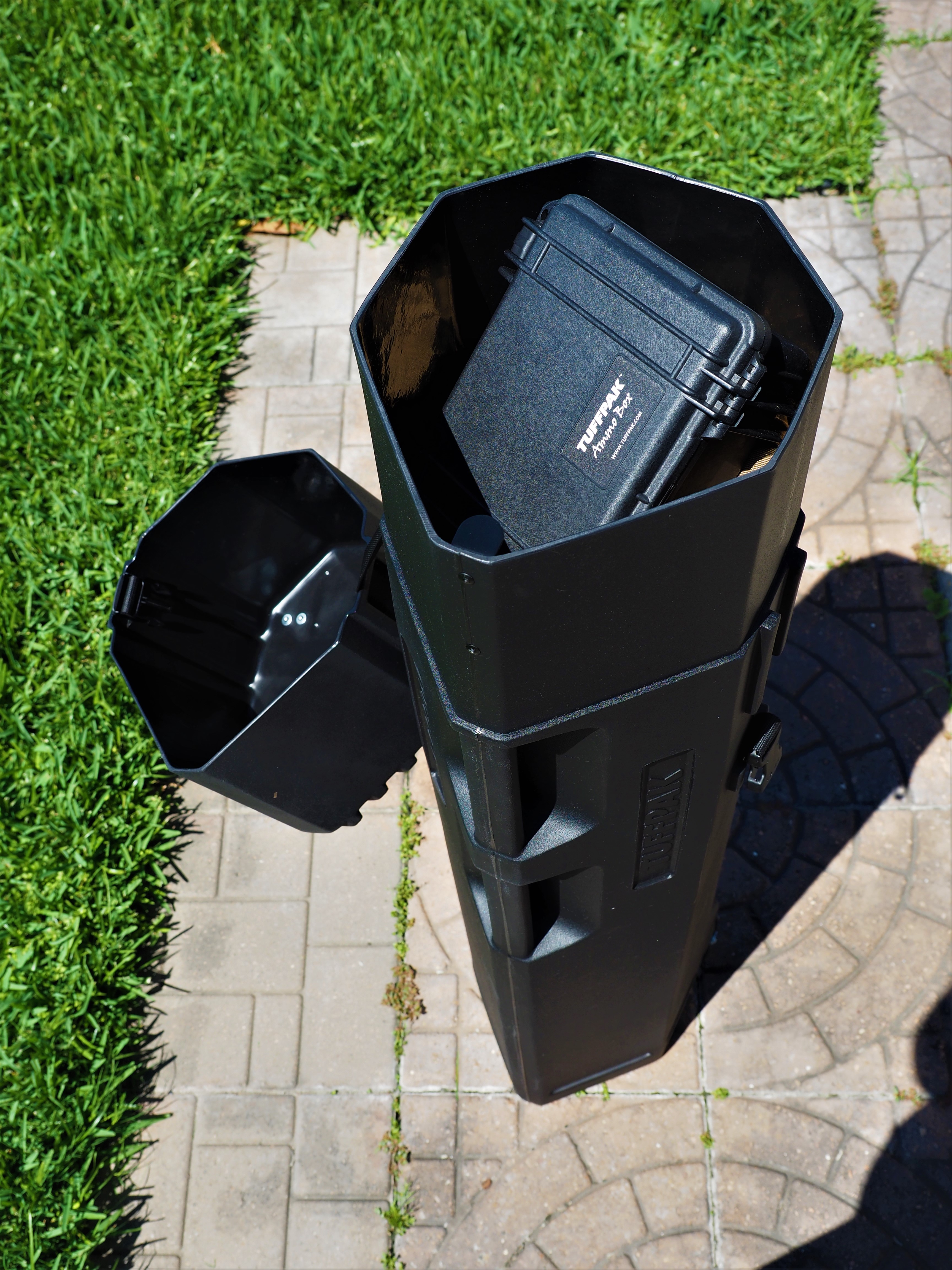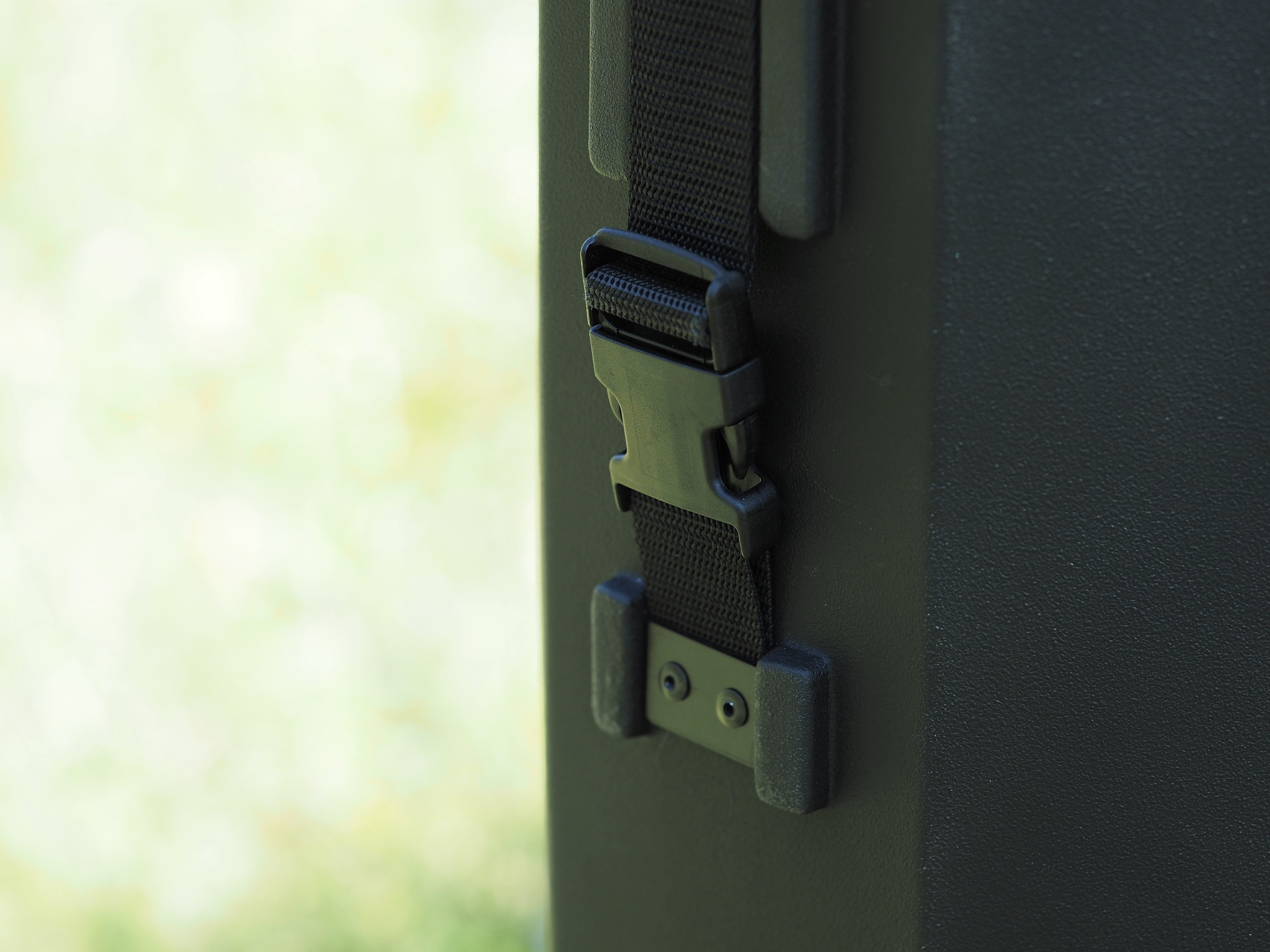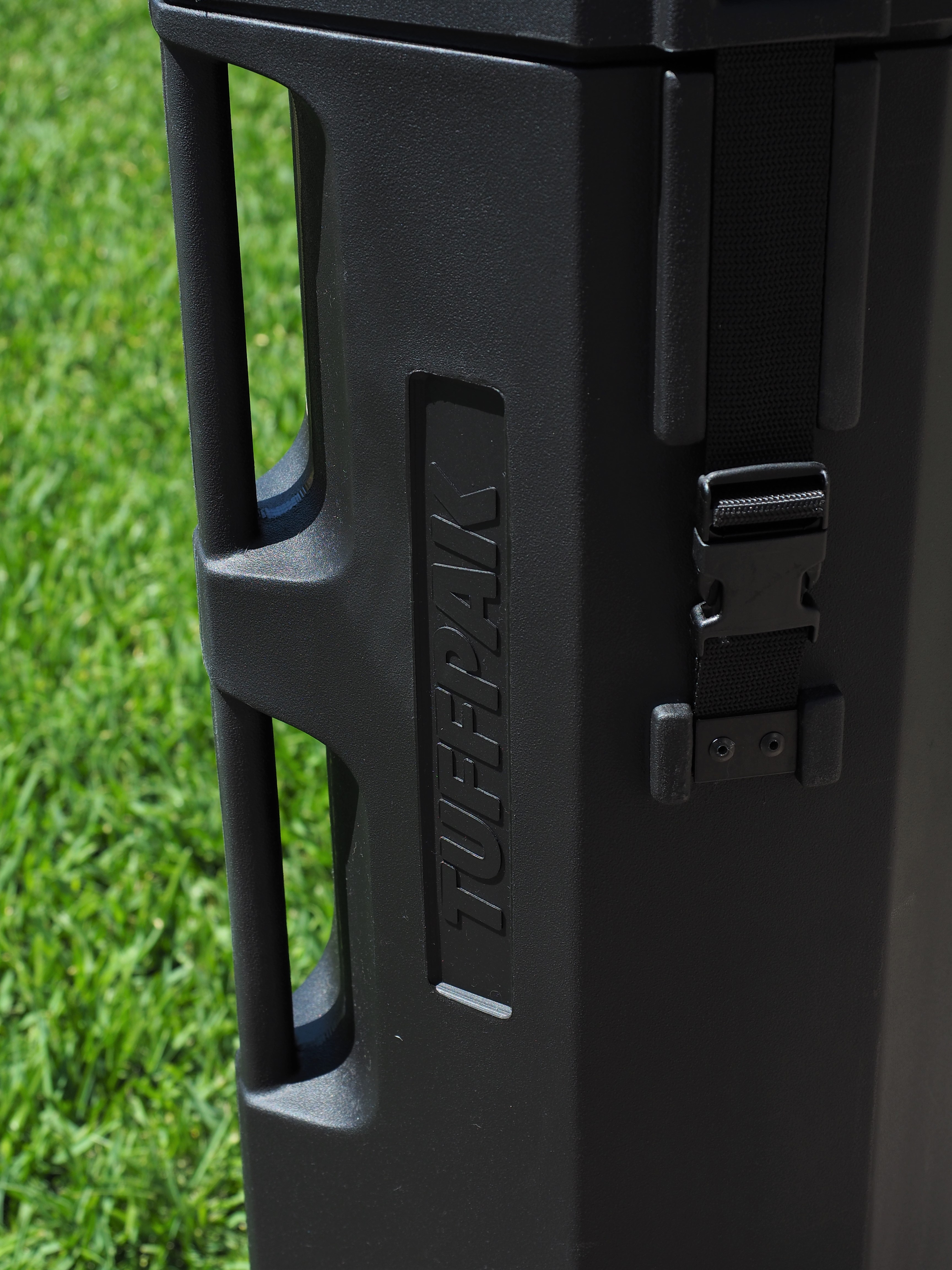 The Tuffpak is surprisingly light-weight for its size coming in at 18 lbs. empty. Far less than some other popular plastic and metal hard cases. The edges of the case are rounded and smooth, making it snag free and car-friendly. I’ve had the corner of my metal travel case rip a whole in my leather seat when I wasn’t being careful. The top of the case has built-in molded grip handles that make it easy to load and pick up. It has a lockable slip-top cover that’s held in place with an adjustable nylon strap and has a comfortable rubber grip handle. The model I received has solid wheels mounted on an axle that’s molded into the base. They remind me of roller blade wheels and seem very durable. I also like how the case surrounds and protects the wheels from travel damage. To test the durability, I laid the empty case on the ground while I bounced up and down on top of it. I am happy to report the case did not break or flex much at all under my 225 lb. frame. Baggage handlers would have a hard time breaking anything on this case. The lock, handle, and strap are reinforced with rivets and molded into the case for extra protection.