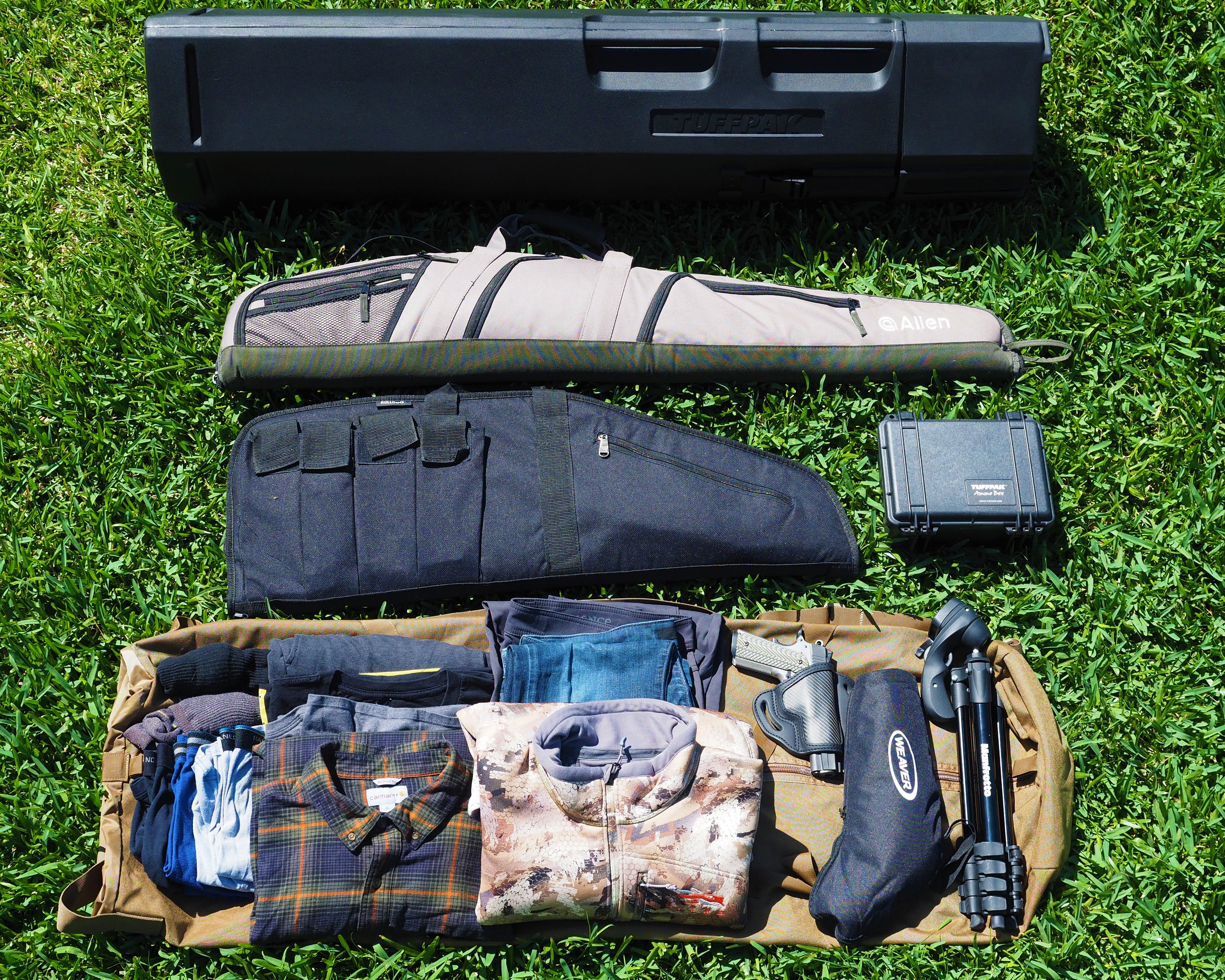 This time I loaded both my rifles in the sack first and slid the end of the sack and rifle cases into the Tuffpak to get it going. Both rifle cases I chose for this were not ideal. They were soft cases, but I could have chosen a better one for the application if they weren’t packed away in storage, giving me more room to work with. I filled in the spaces with my binoculars, spotting scope, tripod, and pistol. I laid clothes between the cases and around the sack as best as I could. As I filled up the sack, I slid it further into the case making sure it was all going to fit properly. Incredibly, I was able to get the lid to latch shut, and lock. The only thing I couldn’t fit were my boots. If I had my other rifle cases, I bet I could have gotten my boots in there too. Thankfully this case has a handle and wheels, because it is heavy with all this gear.