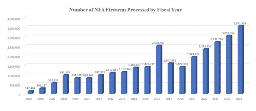 Since 2018, the ownership of these items has spiked by over 250%, with an estimated 7 million NFA items in circulation as of 2021.