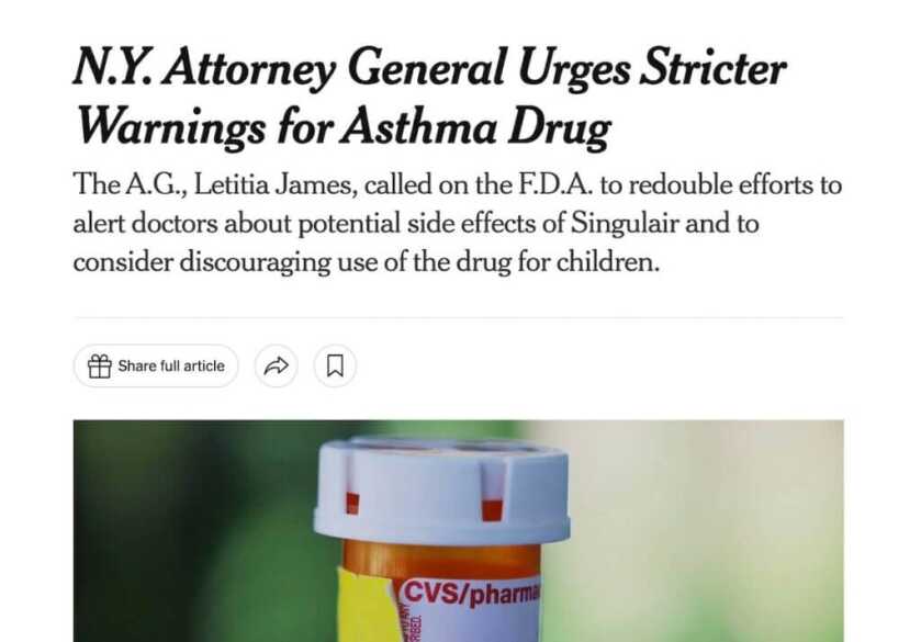 Consider the eye-opening case of Singulair (made by Merck), an asthma medication. A forceful letter this week from the NY State Attorney General’s Office to the FDA blasts the lid off concerning reports of Singulair causing aggressive behavior ( e.g. “rage”) and suicidal thoughts.