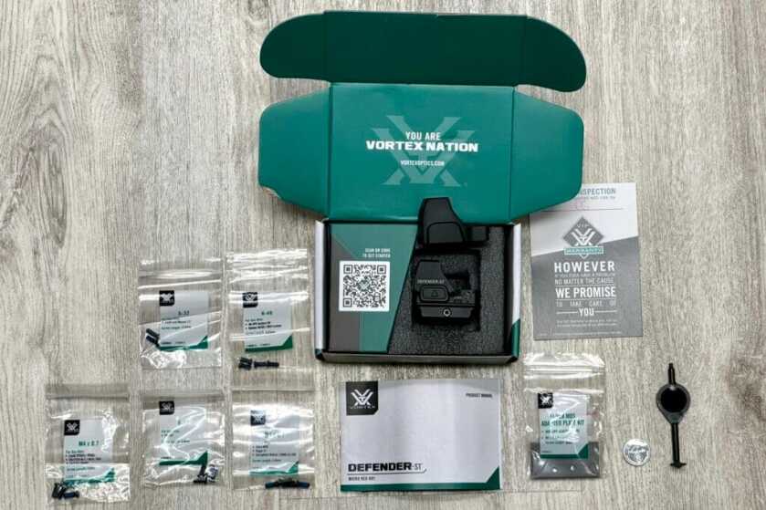 Straight out of the factory, the Defender-ST arrives well-equipped with practically everything you might require. Vortex provides a Picatinny mount, CR2032 battery, Glock MOS adapter plate, lens cloth, custom tool, and a protective cover. What’s more, a variety of fasteners are included to enable the mounting of this red dot on almost all optic-cut pistols available in the market. Vortex’s thoughtful inclusion of extra fasteners is admirable, and they’ve made it easy by labeling each bag with the fastener type and compatible pistols. This simplifies the identification of the set corresponding to whatever pistol you may be using.